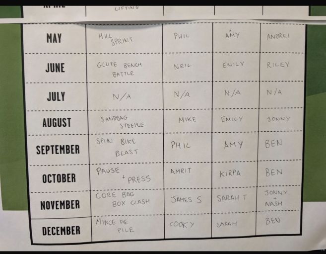 Finally in december we had the rightly names mince pie pile, with a 20kg bumper plate held in a bicep hold, 4 boxes of mince pies were stacked on top, you would be holding the mince pies for as long as possible until your body eventually gave in, we got some really good scores from this challenge, with big dave bringing up the win for the men and sarah going back to back to finish the year off!