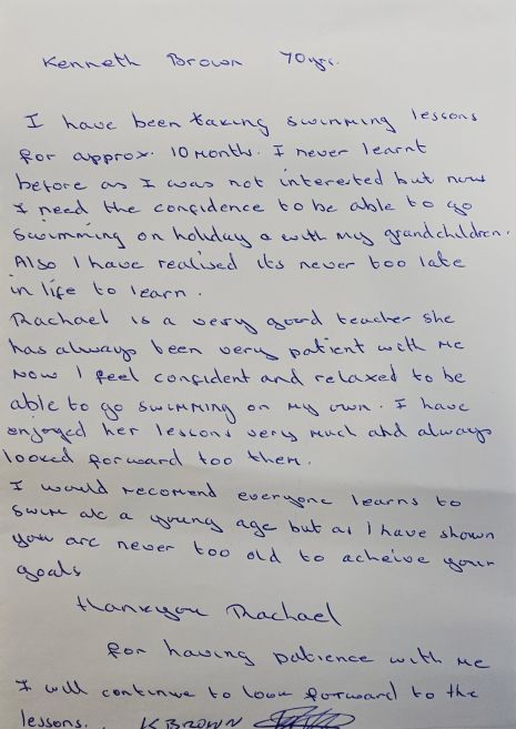 For most of his life, water was something Kenneth preferred to admire from a distance. Family trips to the seaside meant watching from a deckchair, towel wrapped securely around his shoulders as he kept an eye on belongings while others splashed. “I never learnt before as I was not interested,” he shared honestly in a handwritten testimonial - a humble note that has since resonated with many who felt they’d missed their own chance to try something new.