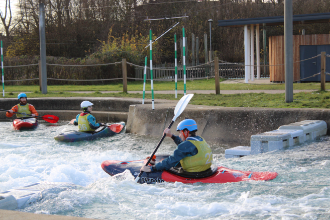 Learning the Olympic Course required time and repetition. Unpredictable flow, fast decision making and navigating around other users can be challenging without visual cues. “I’ve had to take time to learn the course.” Studying course maps, identifying large eddies to pause in, and planning multiple routes helped him build a mental picture of the water. Clear communication was also essential, particularly over the sound of the pumps.